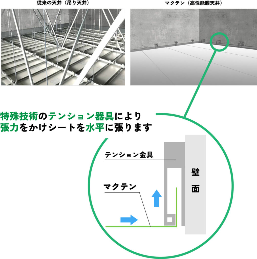 従来の天井は吊り金具で支えられていますが、マクテンは天井を吊らず、壁に直接固定してファイバーシートを引っ張る独自工法を採用しています。